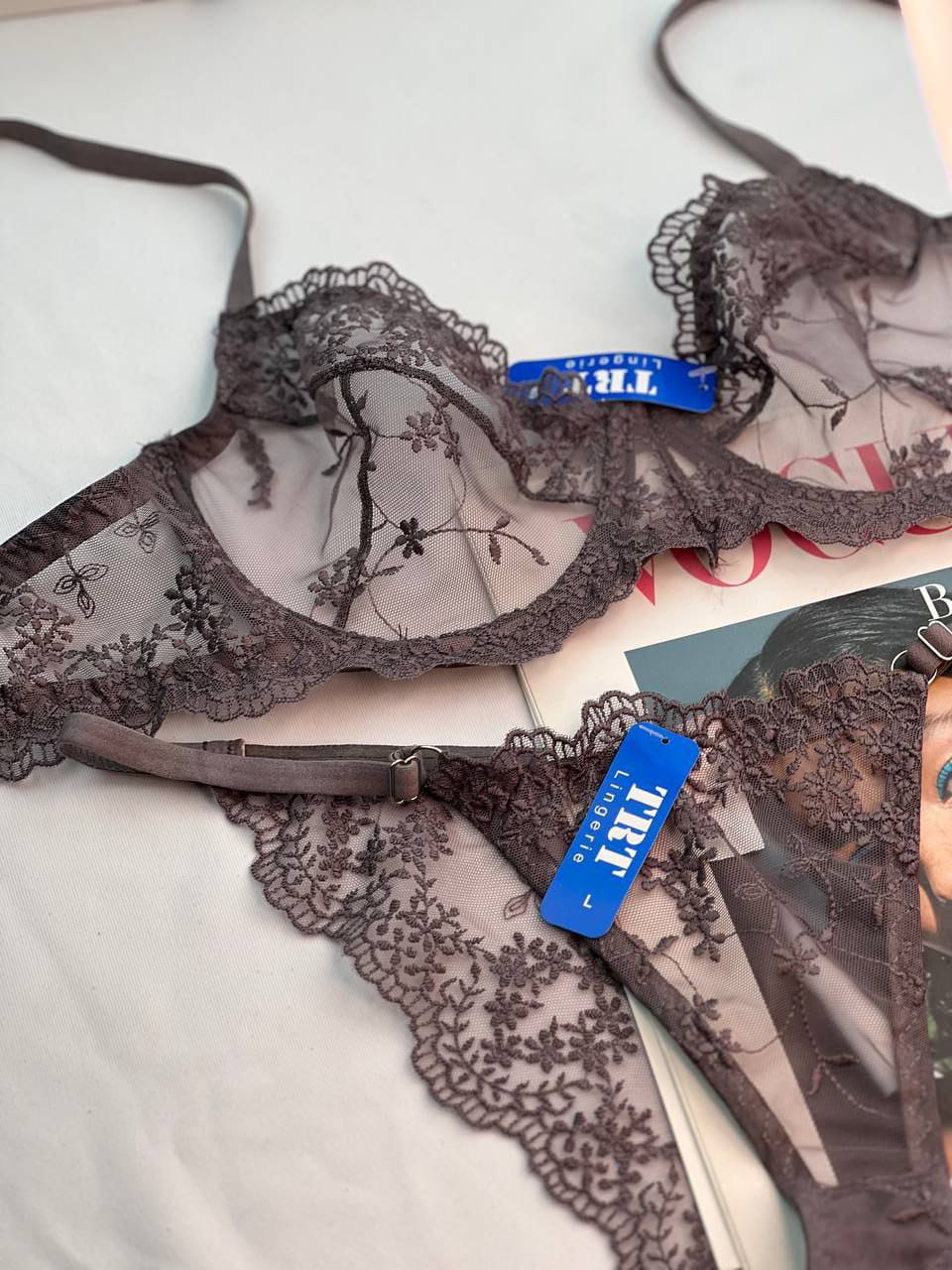 سوتین و شورت این ست کاملا توری و بدن نماست و روی آن طراحی های شیکی کار شده است.