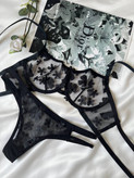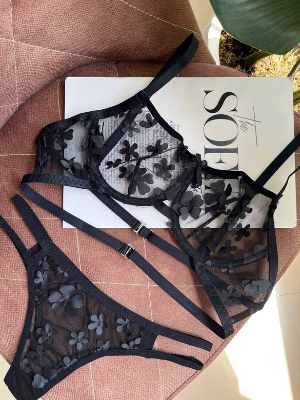 روی سرتاسر سوتین و هم چنین در قسمت جلوی شورت این ست لباس زیر گل های گیپوری خیره کننده ای کار شده است.